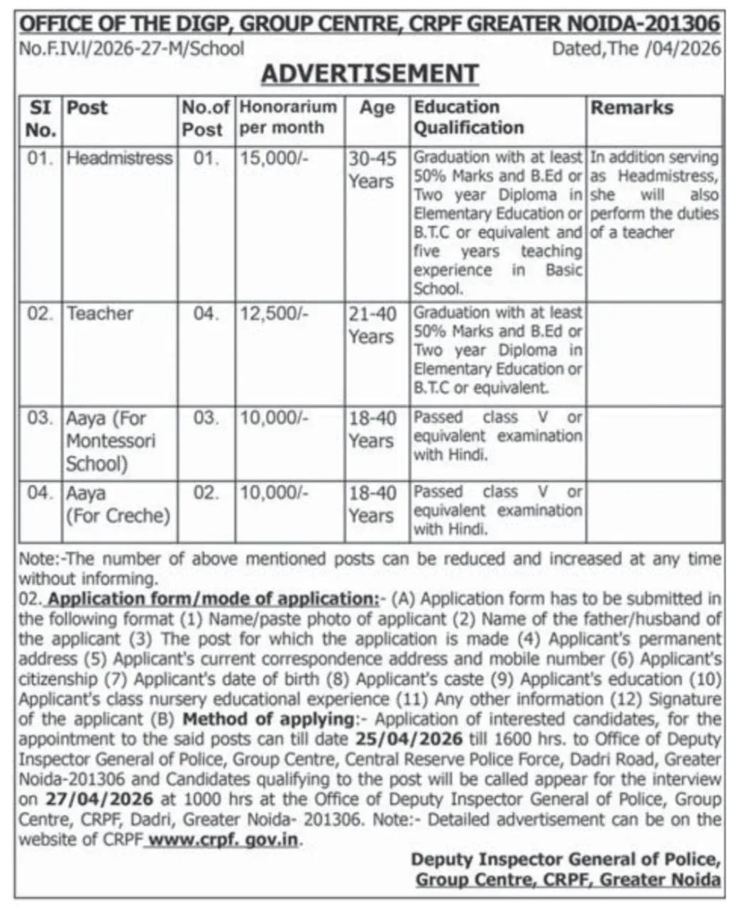 CRPF Group C Recruitment 2026 Apply Now for Teacher & Aaya Posts Salary ₹15,000